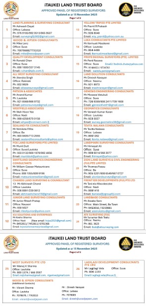 Survey works include land scheme plans and survey instructions related to new lease, lease boundary redefinition, iTaukei Land & Fisheries Commission (TLFC) common boundary redefinition with freehold or state land subject to TLFC endorsement and land acquisition.